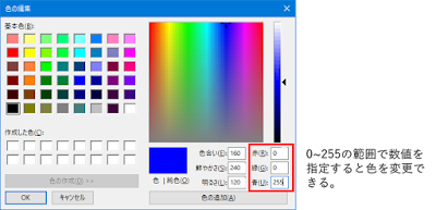 下図のように、R=0・G=0・B=255とすると、「青」の色が作成できます。