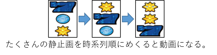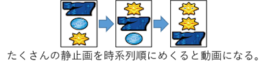 時系列順に静止画をたくさん撮った上で時間順にぱらぱらめくっていくと動画になります。
